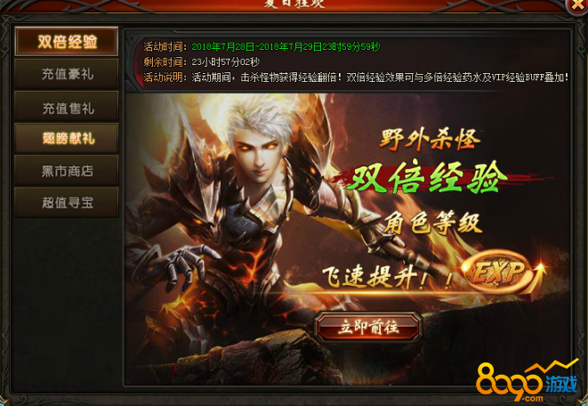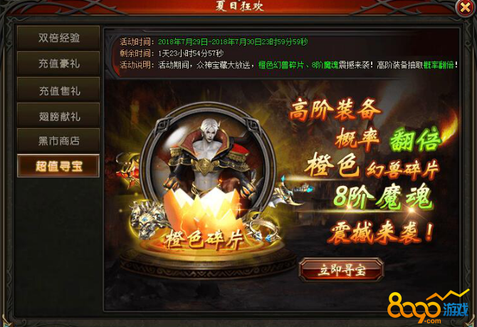 活动说明:活动期间,众神宝藏大放送,橙色幻兽碎片、8阶魔石震撼来袭!高阶装备抽取概率翻倍!