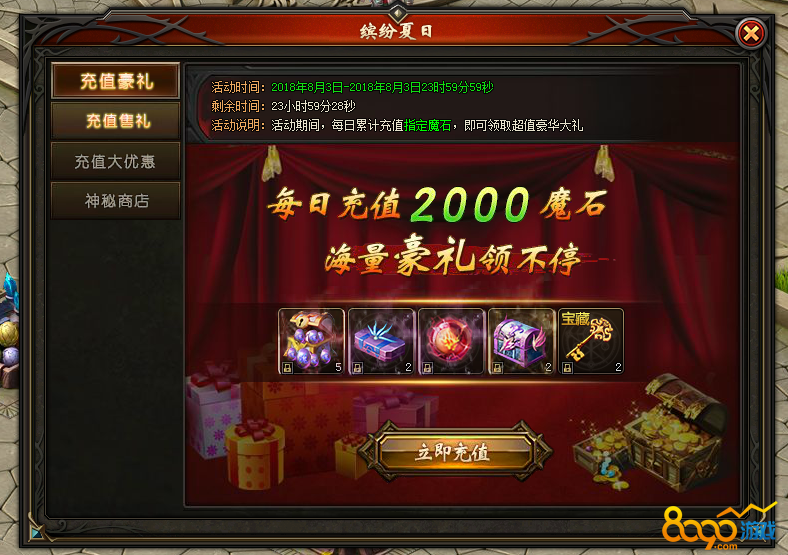 活动说明:活动期间,每日累计充值达到指定魔石数量,即可领取超值豪华大礼