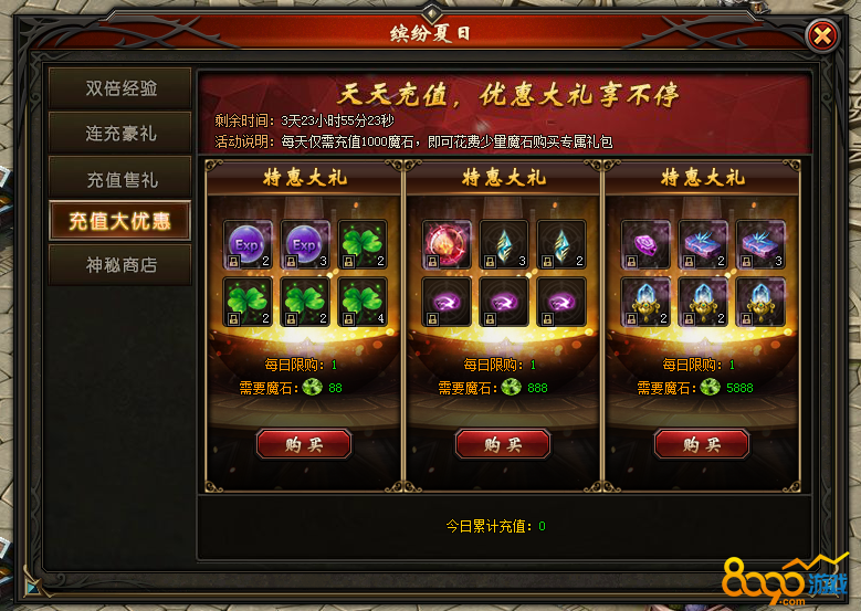 活动说明:活动期间,每日充值满足要求,方可购买超值道具;