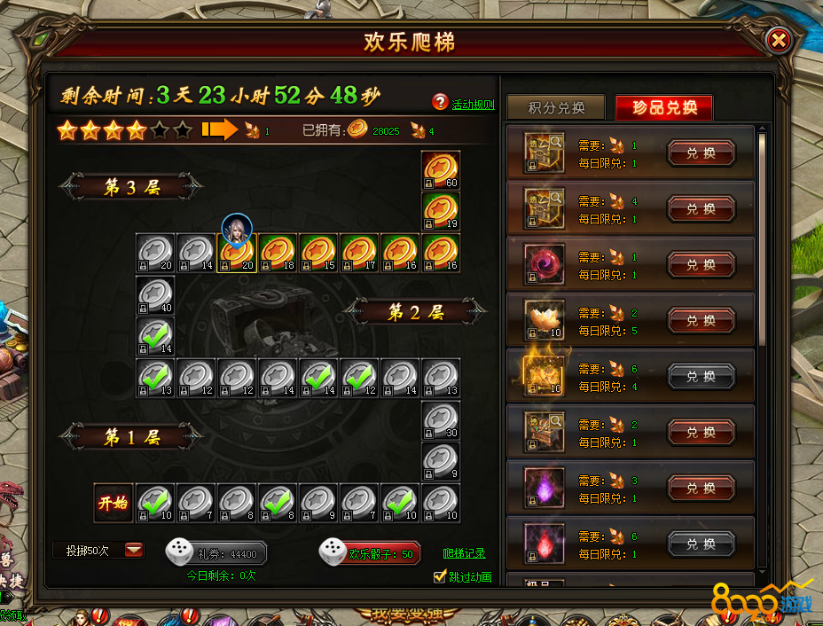 1.玩家可通过使用礼券或者魔石掷骰子爬层,一共10层;