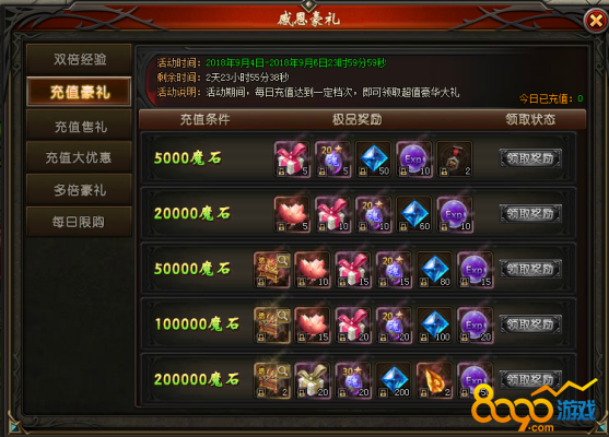 活动说明:活动期间,每日累计充值达到指定魔石数量,即可领取超值豪华大礼