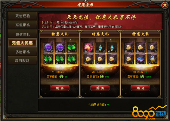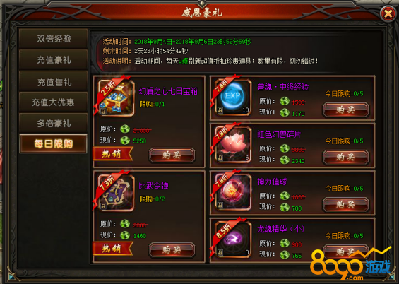 活动说明:活动期间,每日充值满足要求,方可购买超值道具;