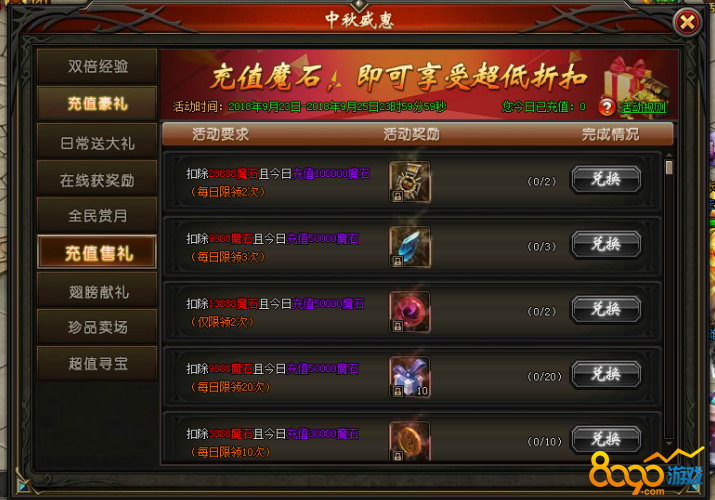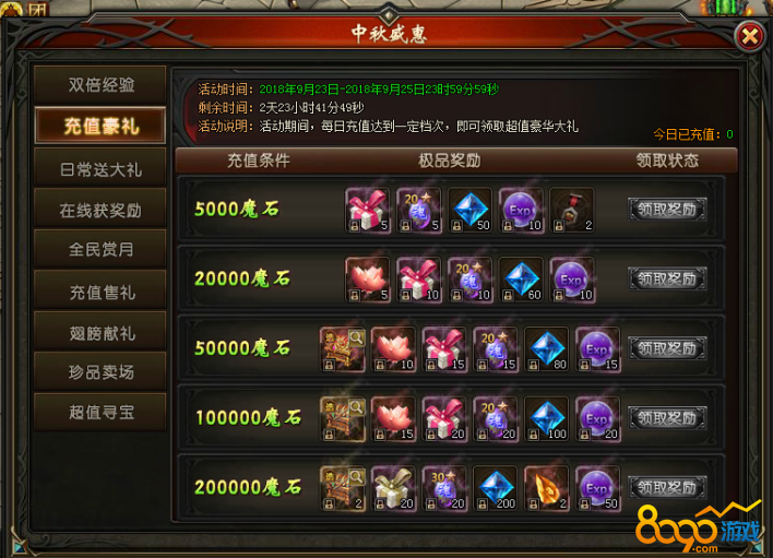 活动说明:活动期间,每日累计充值达到指定魔石数量,即可领取超值豪华大礼