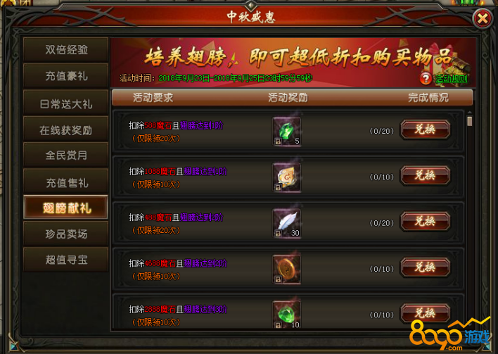 活动说明:活动期间,翅膀到指定阶数且消耗少量魔石可领取活动奖励,阶数越高,奖励越丰厚!