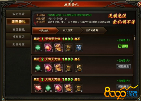 活动说明:活动期间,累计3天每天充值10元、100元、300元可领取对应奖励!