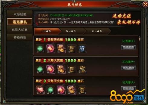 活动说明:活动期间,累计3天每天充值10元、100元、300元可领取对应奖励!