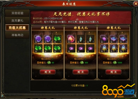活动说明:活动期间,每日充值满足要求,方可购买超值道具;