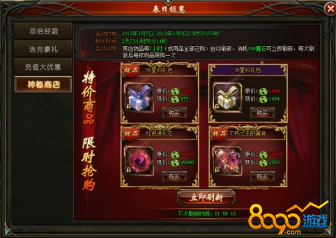 活动说明:商店物品每2小时(或商品全已购)自动刷新,消耗199魔石可立即刷新,每次刷新后每样物品限购1次
