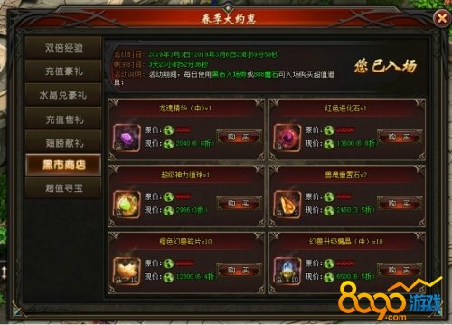 活动说明:活动期间,每日使用黑市入场券或888魔石可入场购买超值道具;