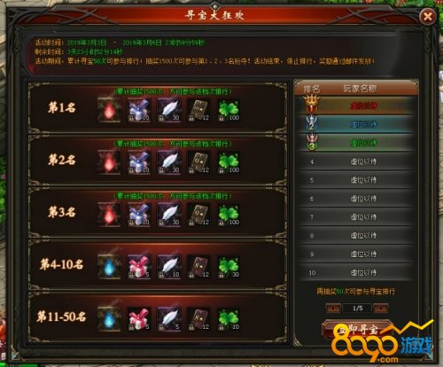 活动说明:活动期间,累计寻宝50次可参与排行;抽奖1500次可参与第1、2、3名抢夺!活动结束,停止排行,奖励通过邮件发放;