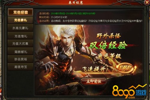 活动说明:活动期间,众神宝藏大放送,橙色幻兽碎片,8阶魔魂,高阶装备抽取概率翻倍,限时3天,切勿错过!