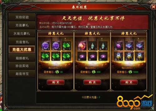 活动说明:活动期间,每日充值满足要求,方可购买超值道具;