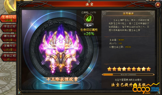 新添13阶生命印记、帝龙之泪、曙光战魂、圣耀符文法宝;