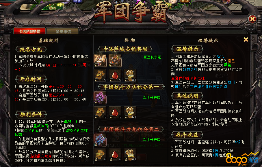 2.申请的进攻方军团在军团战结束前占领战神之柱,并且摧毁圣战神石,即为胜利者;