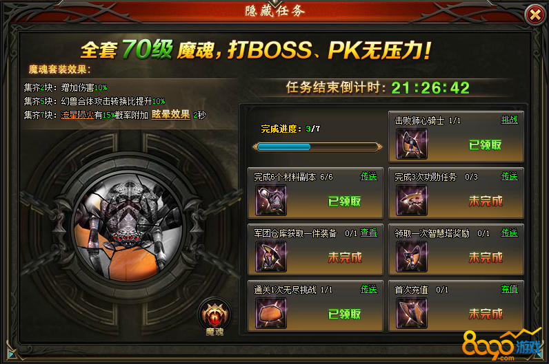 游戏中,魔魂套装的效果为集齐2块增加伤害10%,集齐5块幻兽合体攻击转换比提升10%,集齐7块技能死神裁决有15%概率附加眩晕效果2秒。而玩家们则需要完成7项任务来获得魔魂套装的碎片,分别为:击败狮心骑士、完成6个材料副本、完成3次功勋任务、军团仓库获取一件装备、领取一次智慧塔奖励、通关1次无尽挑战、首次充值。