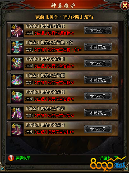 二转以上的神力装备才可以觉醒,两件相同的普通装备可以觉醒为白银装备,两件相同的白银装备可以觉醒为黄金装备。