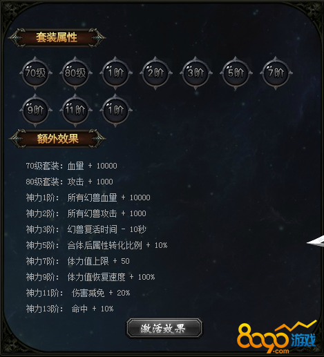 当玩家收集齐了8件套装,就可以激活相应等级的套装属性,小侠在新服目前是2阶神力装备,但武器只是80级,腰带是神力1阶的,所以未能激活神力2阶,和神力1阶的套装属性。