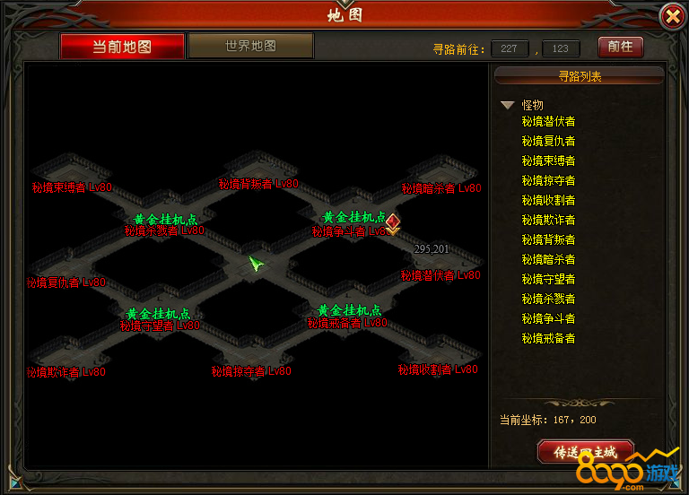 挂机秘境有4个挂机黄金点,怪物很密集,非常适合挂机,建议开启双倍经验,挂机秘境还会掉落符文、精华等法宝经验道具;玩家不需要跑到黄金挂机点,只需要点击传送,人物会自动传送过去。