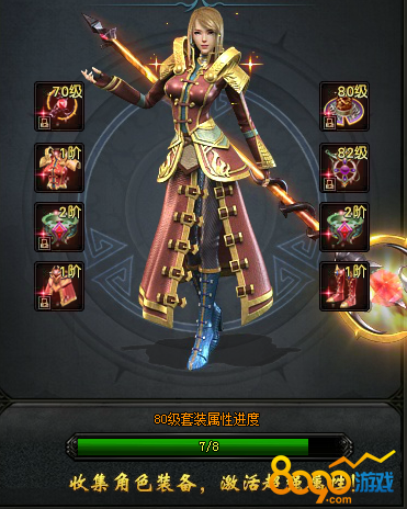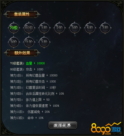 当玩家收集齐了8件套装,就可以激活相应等级的套装属性,小侠在新服目前是2阶神力装备,但武器只是80级,腰带是神力1阶的,所以未能激活神力2阶,和神力1阶的套装属性。