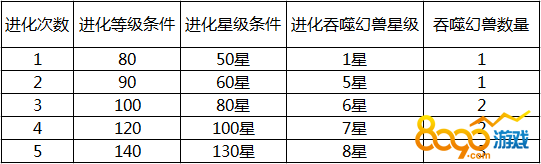 搜索"8090网页游戏"魔域永恒游戏中当幻兽培养到一定等级与星级时,可以进行进化。幻兽进化需要吞噬同类型幻兽,数据如下: