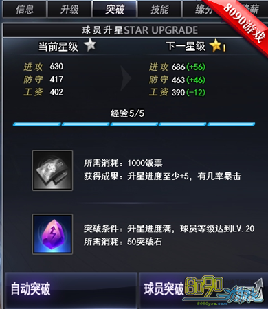 而从1星球员突破到2星球员,升星进度条总长15,消耗1000饭票升星进度条至少+5,所以在不出现暴击的情况下最多需要消耗饭票1000*3,球员等级达到30级 需要消耗100突破石,升星后等级上限提升到40级。