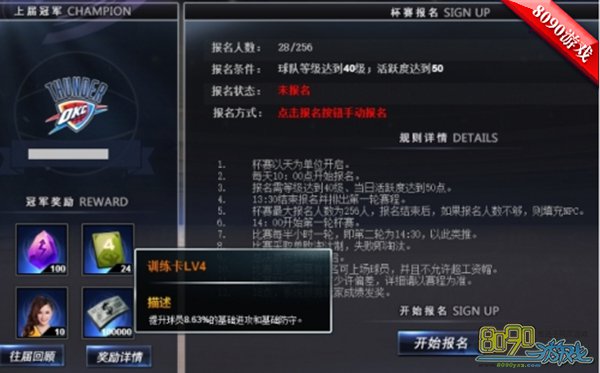 每日杯赛的奖励还是很丰富的,冠军奖励很给力100个突破石、24张训练卡LV$等级提升球员8.63的基础属性、10个橙色超级篮球宝贝、10W饭票。对于非RMB玩家来说虽然冠军有点远,但我们也争取参加拿些小奖励。每日杯赛顾名思义就是以天单位开启,每天10点开始报名,13点半截止报名。