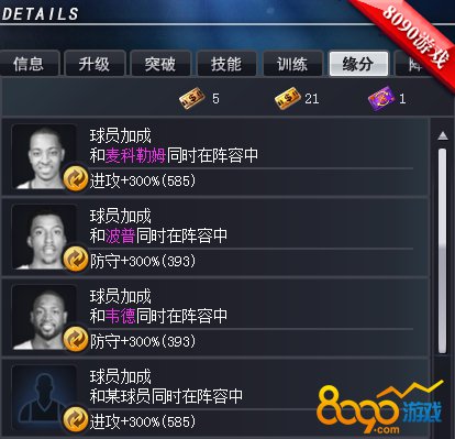 搜索"8090网页游戏"在8090NBA范特西中,每位球员都有自己的球员缘分,当同球员缘分的中的球员同时在阵容中可以获得进攻力或者防守力的加成,当然对缘分球员不满意时可以使用“缘分刷新卡”进行刷新,组合自己心仪的缘分阵容哦。