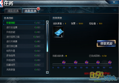 任务系统分球队任务和活跃任务,玩家通过接受任务,完成任务,领取获得任务奖励