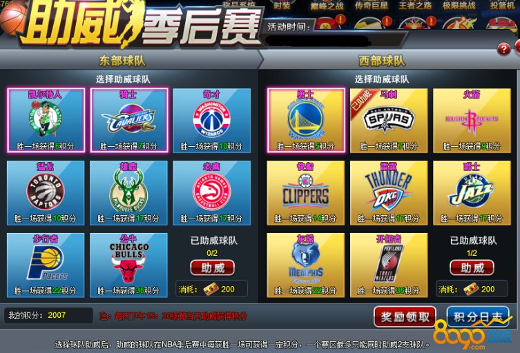 1)活动期间玩家可分别选择东部、西部两支季后赛球队进行助威;