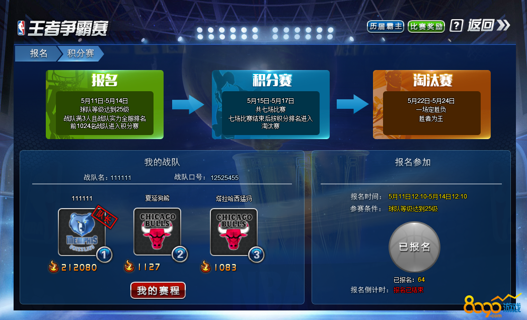 d) 报名结束后,玩家所在跨服报名的战队中,战队实力排名前1024名战队,且战队人数不少于3人的战队、且战队成员没有超帽的战队进入积分赛;报名战队少于64队时取消本届王者争霸赛;