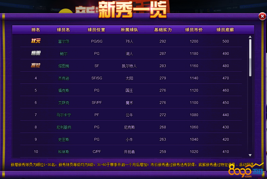 2017新秀只增加第1-30顺位球员,第31-60顺位的开赛一个月后添加。同一名新秀球员有市价和底薪区别,市价新秀通过新秀选秀获得,底薪新秀通过活动、道具获得。