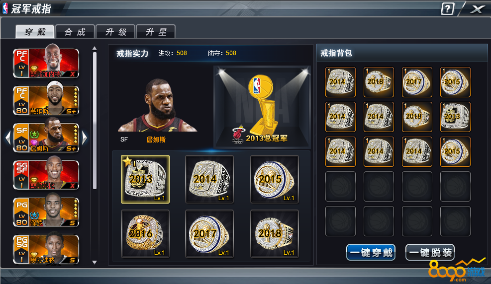 (2)、通过收集2013至2018年的冠军戒指碎片可以合成不同的年份戒指。
