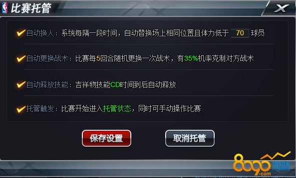 1、 球队达到80级后,教练系统可使用比赛托管功能,适用于任何比赛,可设定固定体力换人,自动更换战术。
