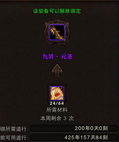 九龙神火符是解绑装备的唯一材料。可以在珍宝阁购买。