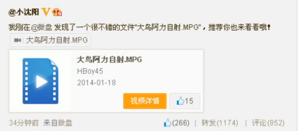 3月20日下午四点左右,小沈阳在微博上分享了男性自慰视频,这个视频的名字叫“大鸟阿力自射”,疑似是高High的色情片段。有网友下载之后发现视频尺度相当大,因此不禁质疑其性向,更质疑已经身为人父的他这么做是否得当。网友纷纷前去围观。该条微博短时间内转发过千,评论过百。不过小沈阳很快便删除了该条微博。