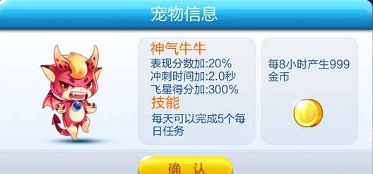 神气牛牛表现加20%,冲刺加2秒,飞行加300% ,5个每日任务,每8小时产生999钻石。
