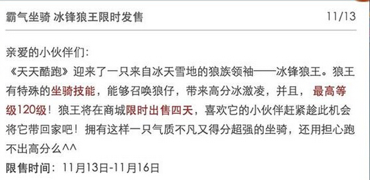 相信不少天天酷跑的玩家都有所听说,冰锋狼王是限售发售的吧,究竟是怎么回事呢?快快随小编一起去游戏中了解一下吧。