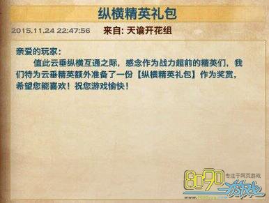 值此云垂纵横互通之际(说白了就是合服),感念作为战力超前的精英们(条件来了,各服务器战力靠前的才有),我们特为云垂精英额外准备了一份纵横精英礼包作为奖赏,希望您能喜欢!祝您游戏愉快~