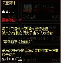 搜索"8090网页游戏"傲视遮天里所有玩家都知道挂机要买双倍或者三倍,可是除了这两个挂机还要买什么能让挂机更快更效率?当然只有深蓝灵珠,此物就是为挂机而生,虽然也需要1280元宝才能购买一个,但是各位玩家仔细想想,镇魔塔闯一次可是要好几千元宝的,而且越到后期需要的元宝越多,相对的经验也拿不到那么多了,得不偿失。而深蓝灵珠,没杀3只怪就有好几万经验,怪物等级越高还拿的越多,如果赶上每天的系统双倍时间自己再吃个三倍宝典再配合深蓝灵珠,我敢说绝对还要比镇魔塔快上一些,当然了挂机是不可能拿到两个4铁的。孰轻孰重,要选择哪个就看玩家自己了。