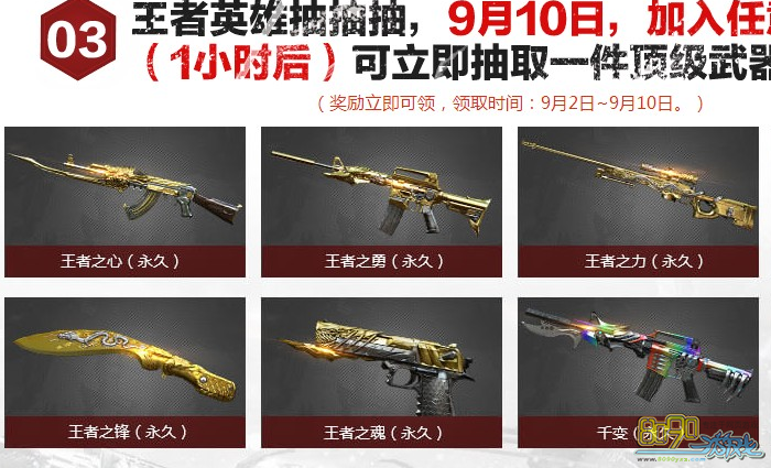 cf9月10号在线即可抽取永久英雄武器,不过很多玩家可能没有注意到这个活动还有第二页,第二页里面全是7天的,所以大家不要高兴的太早。至于抽到永久武器几率嘛自然也不会太高,主要就是吸引玩家在线游戏的。