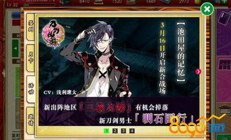3月16号开启了新合战场,三条大桥为夜战模式,该模式下短刀属性提升。新出阵地区三条大桥有机会掉落新刀剑男士明石国行。等游戏更新完毕就可以进入新地区哦~