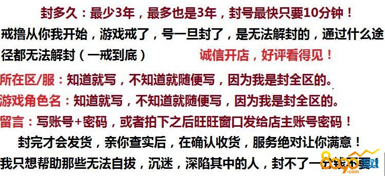 还有一种是玩家身边知道玩家账号的人上淘宝封玩家号给玩家戒网瘾。可能是玩家平时忙于游戏忽略了身边人的感受吧。