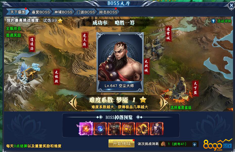 搜索"8090网页游戏"天剑狂刀天下霸图是一个有很多奖励的活动,玩家击杀BOSS能够获得掉落,每个难度的首通奖励和全服的排名奖励。