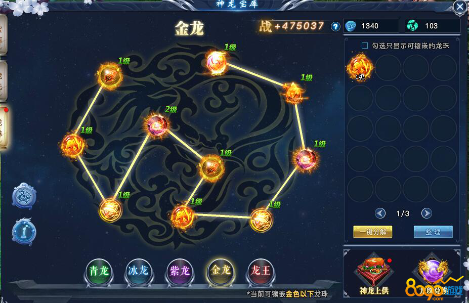 玩家镶嵌相应颜色的龙珠能够激活对应的神龙属性,玩家也可以对龙珠进行升级,当所有龙珠达到2级时能够升级隐藏属性达到2级。金龙和龙王中最后的两个龙珠是特定龙珠,只能够镶嵌特定的龙珠,这几个龙珠玩家可以在龙珠兑换中获得。