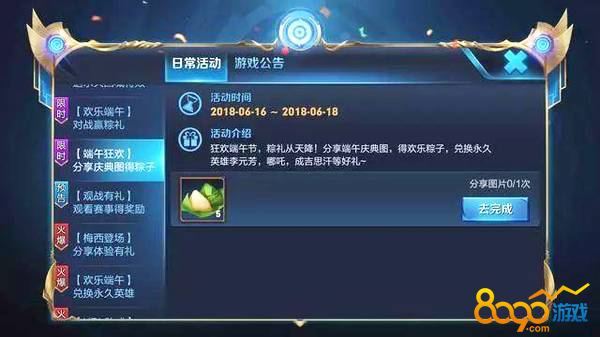 搜索"8090网页游戏"王者荣耀端午节活动已经开启,然而完成的任务也是非常简单的。任务全部完成就可获取免费英雄或是5个英雄碎片。