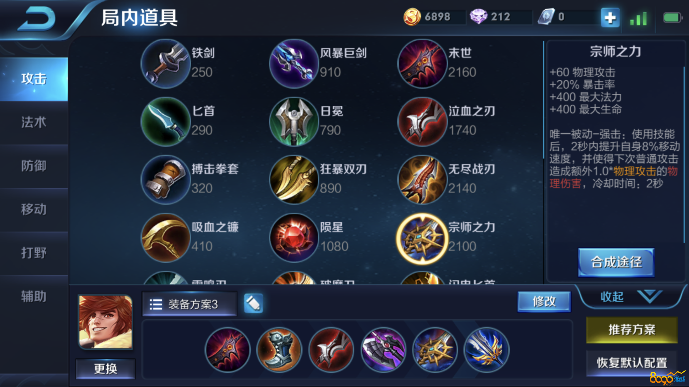 上图是我个人对于裴擒虎上单装备的选择,仅供参考,玩好裴擒虎的关键就是对前中期的掌控,只要能在这方面做好,取得胜利还是很轻松的。