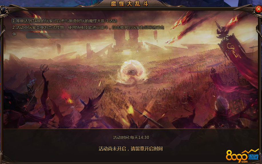 活动每天14:30-15:00开启,等级达到74级的玩家可以参加魔怪大乱斗活动,活动中玩家会变身为各式怪物,使用特殊技能进行战斗,以击败其他玩家为目标进行竞争,活动结束后跟进积分进行排行,活动前三名均可获得100钻石奖励,每天仅可参加一次。