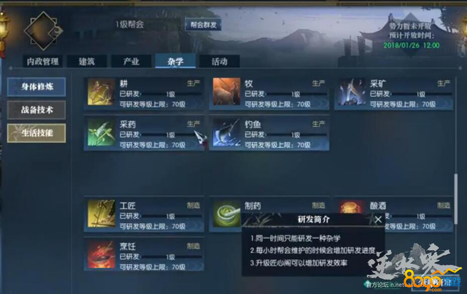 帮会建立以后杂学下面分类身体修炼和生活技能,这2个分类同时间只能研发一个,可能后期可以研发多条,这里的问题是:研发没有进度条显示,帮权杂学里也只有蓝色线条上下跳动,建议不删档测试加入倒计时显示研发进度