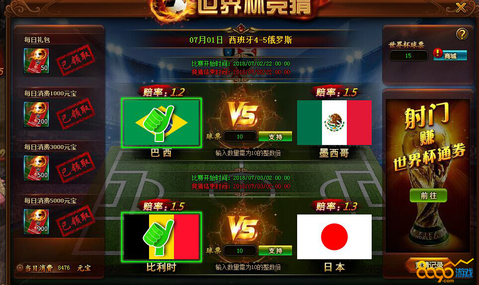 搜索"8090网页游戏"最近比较火热的话题莫过于就是世界杯,各种什么爆冷啊,黑幕啊等等这些。有些人就为此输了很多钱,那么在封神霸业中融入了世界杯的竞猜,让你体验“赌球”的同时,也能够愉快的玩游戏。