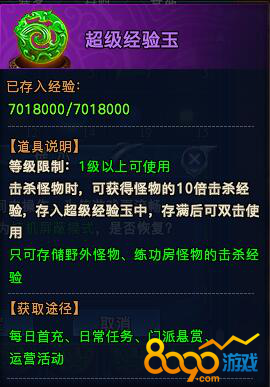 玩家通过充值活动可以获得超级经验玉,在获得超级经验玉之后玩家击杀怪物,可获得怪物的10倍击杀经验,存入超级经验玉中,存满后可双击使用,需要注意的是超级经验玉,只可储存野外怪物、练功房怪物的击杀经验,获取途径为每日首冲、日常任务、门派悬赏、运营活动。